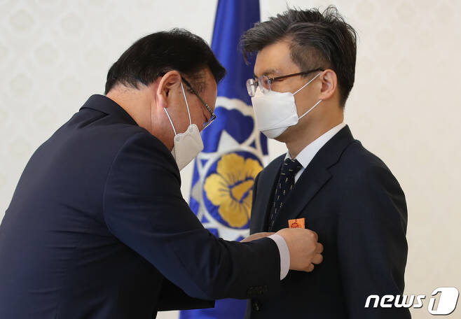 [김부겸 국무총리가 2일 오전 서울 종로구 정부서울청사에서 열린 규제개혁 유공포상에서 권기석 과학기술정보통신부 과장에게 근정포장을 수여하고 있다]