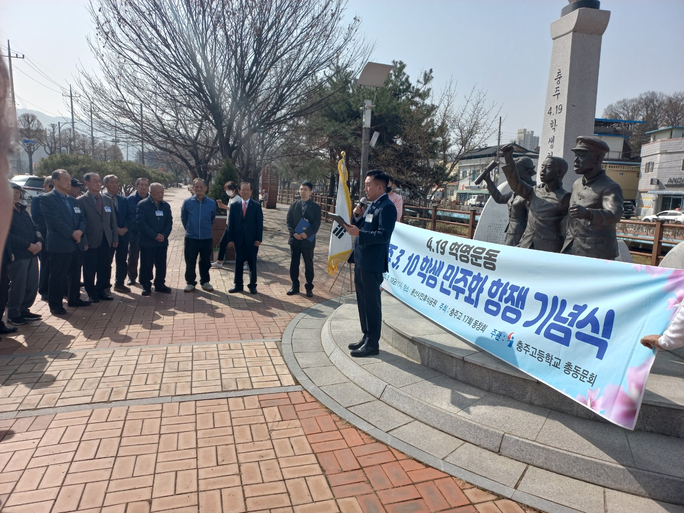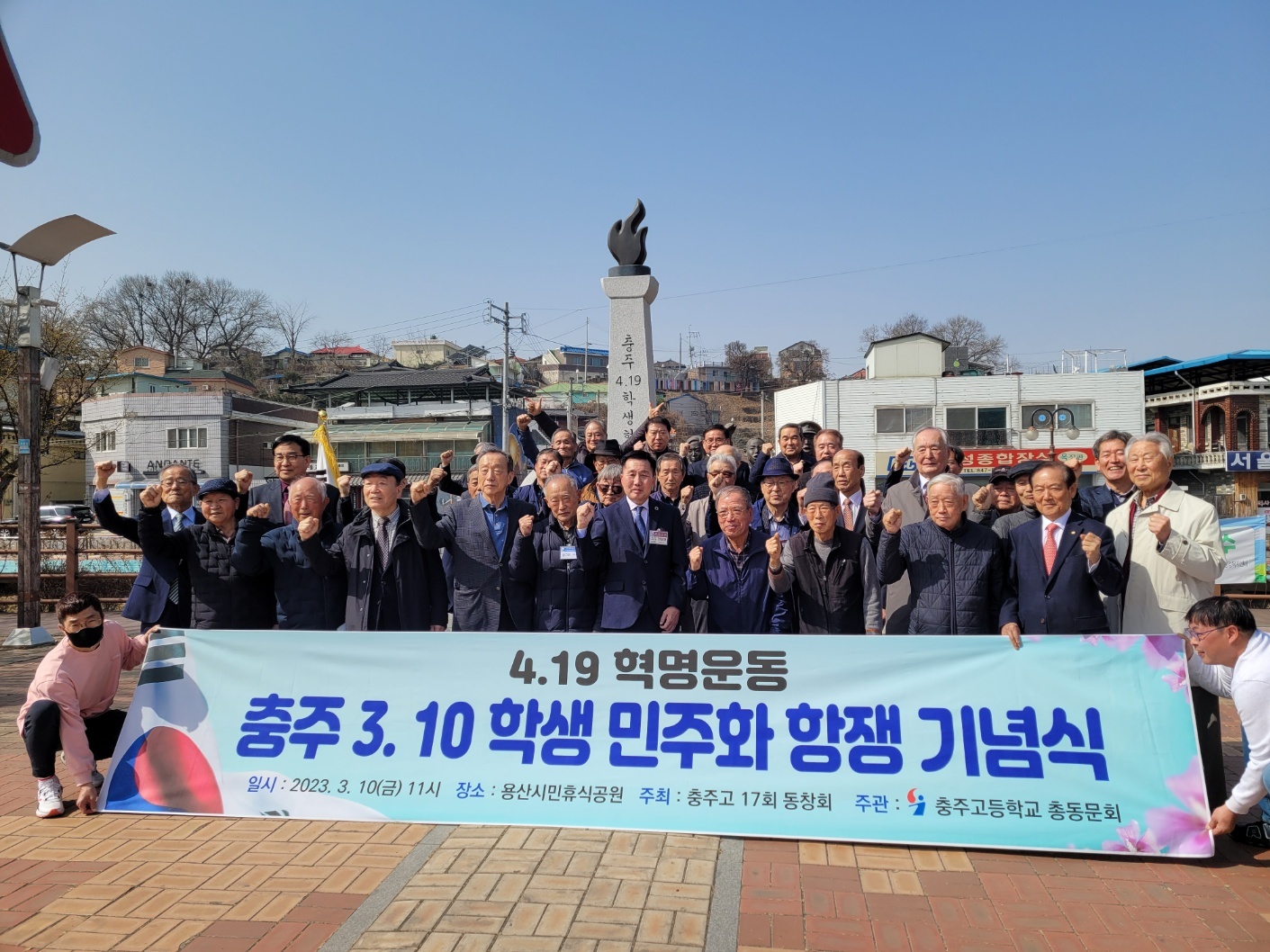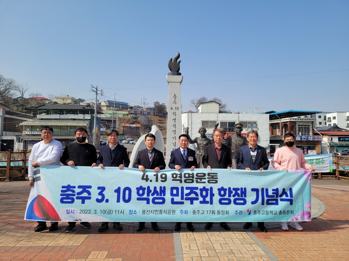 지난 3월 10일 용산시민 휴식공원 ‘4.19 학생혁명 기념탑’에서 총동문회 회장단 및 사무국과 제17회 동문, 31회 이규홍 추진위원장등 총 40여명이 참석한 가운데 ’충주 3.10 학생 민주화 항쟁 기념식‘을 가졌다.